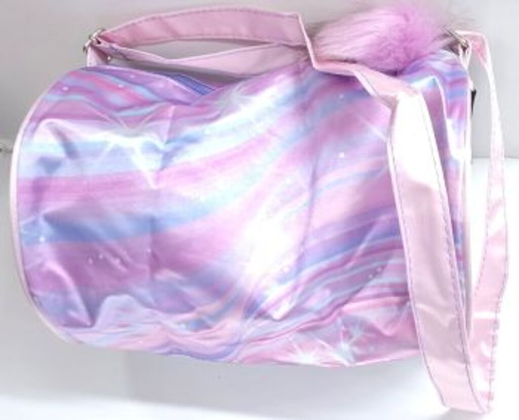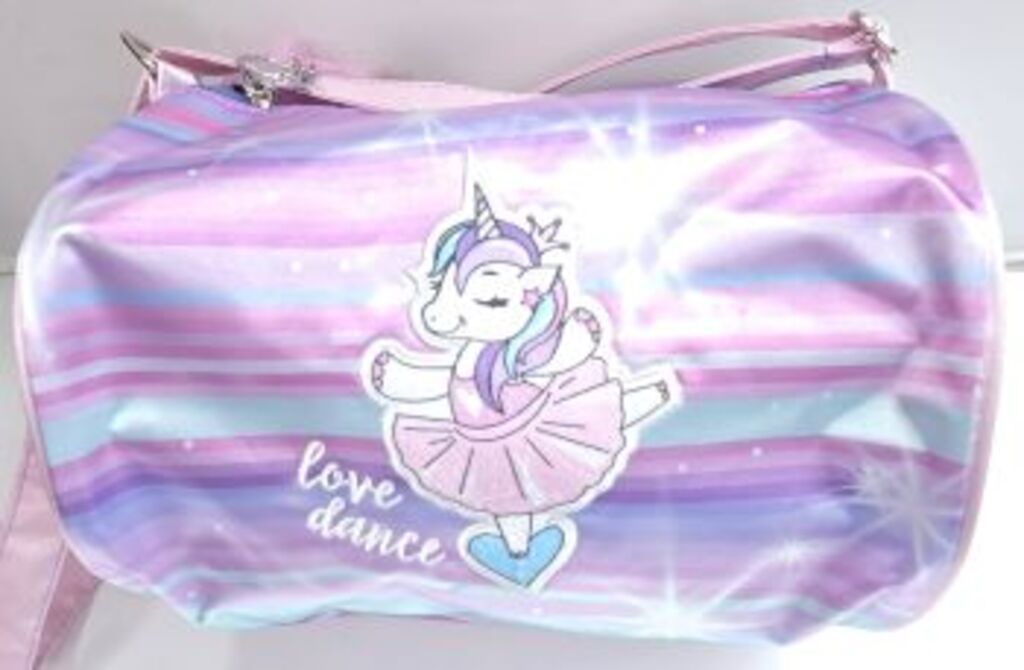 This adorable unicorn dance duffel will be every kid's favorite! Featuring a rainbow color print fabric, a dancing unicorn and the words "love dance" embroidered on the front. This roll duffel also includes a side zipper pocket, heart zipper pulls and a soft pom-pom attached to the zipper pull. The inside compartment is fully lined, zips closed, wipes clean and folds flat.
