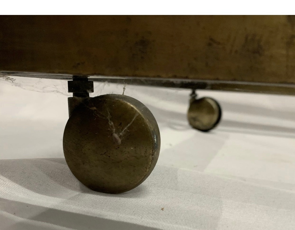 Mid-century modern brass and glass bar cart/rolling table. Used as a bar cart, a phone station, and a coffee station. Age appropriate wear.This table is so heavy, that over time one caster was compromised. Needs fix or remove. Retail value ets.over $2k.