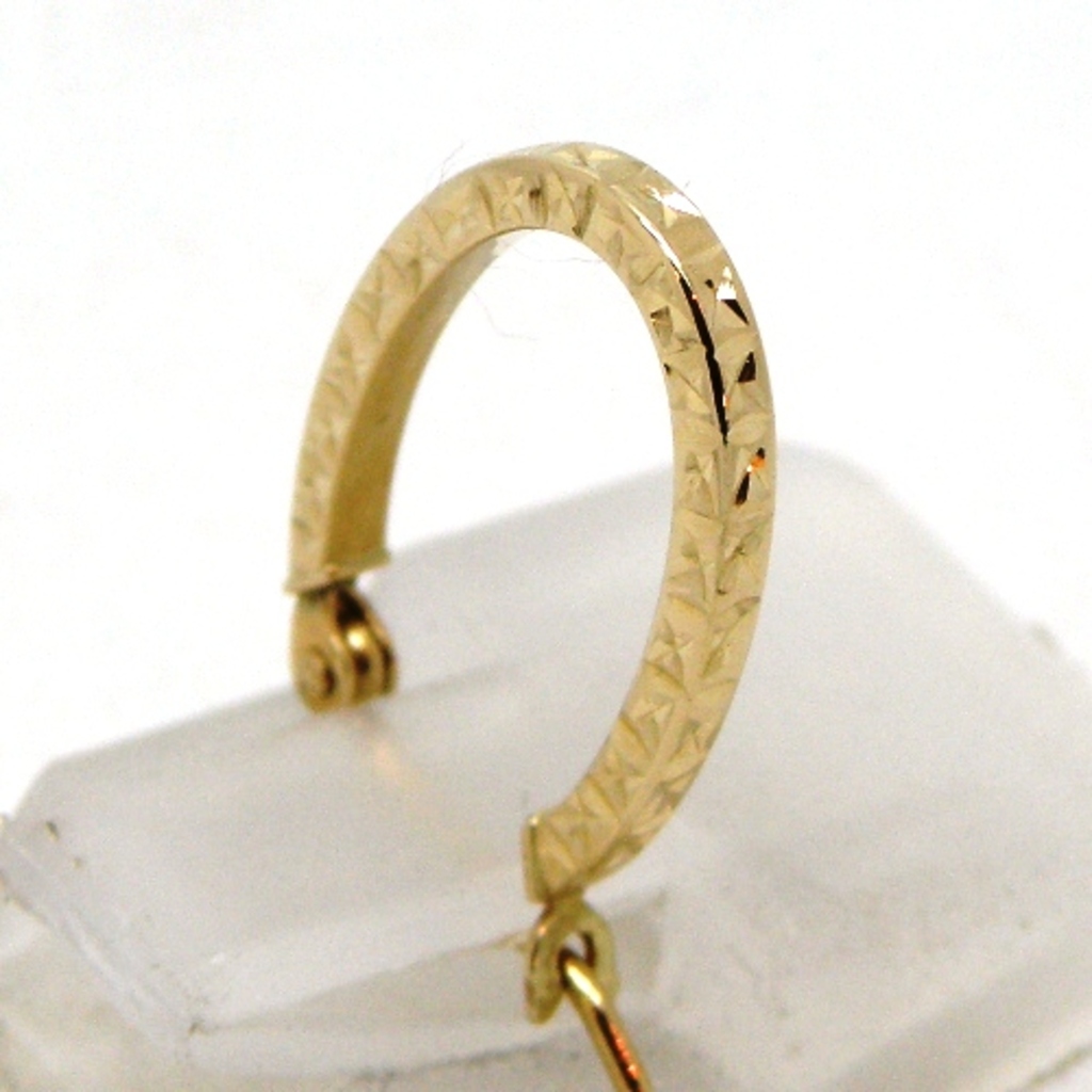 14k yellow gold earrings. These dainty yet dashing hoop earrings come in a oval shape that features diamond cuts all around the earring, to give it a bedazzling touch. These are a heavy piece that weigh 0.9 grams and has a secure snap closure allowing it to be worn carefree all day. They measure 11.5mm diameter and 1.5mm wide. These pair of dashing earrings would make an excellent addition to add onto your collection.