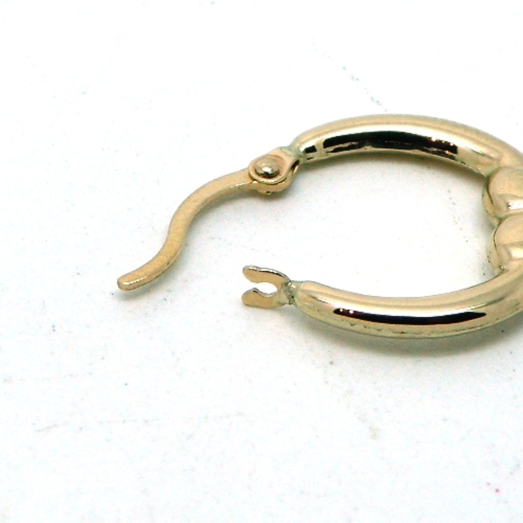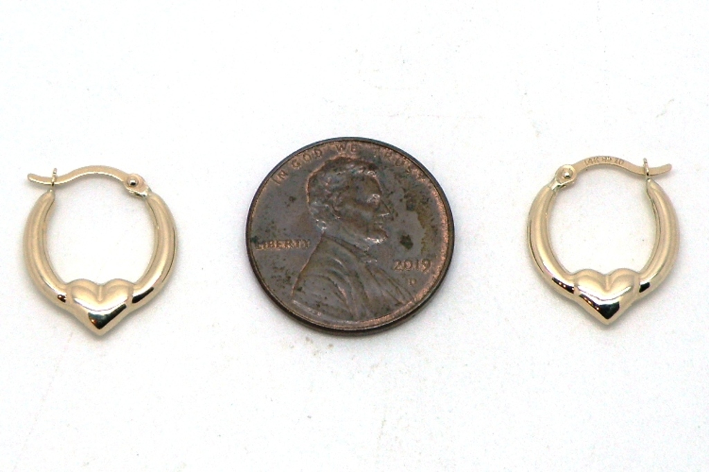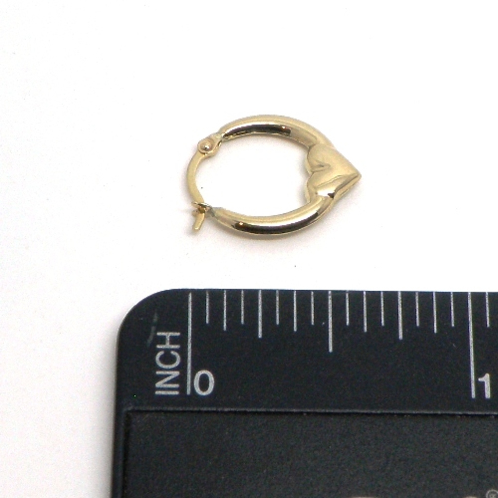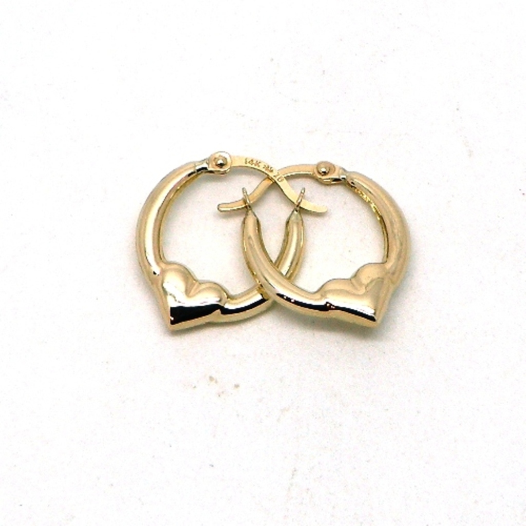 14k yellow gold earrings. These simple, yet pretty baby hoop earrings feature a heart in the center to give it a dashing look. They weigh 0.53 grams and have a secure snap closure allowing it to be worn carefree all day. They measure 16mm diameter and 2mm wide. These earrings would be an amazing gift to a daughter or grand daughter, whom ever you desire to gift to.