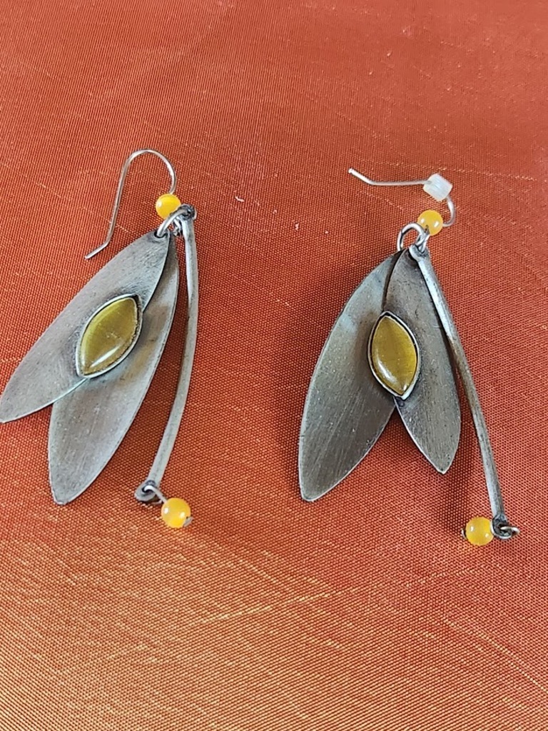Pre-owned Created by Jim Mullins, juried art-winning jewelry artist Very lIghtweight 3-layered aluminum or patina earrings with yellow bead adornments Hang down 2 3/4"