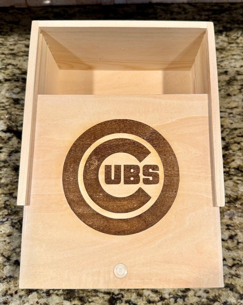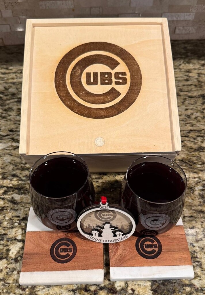 This listing is for a Chicago Cubs 6 Piece gift set. You will receive a 6 piece gift set including laser engraved box, 2 glasses, 2 marble/acacia wood coasters, and a handcrafted ornament. Boxes measure 8 x 8 x 4 and have a sliding lid with divot for easy opening. We can also make gift boxes for any team you'd like including college, NFL, High school, more. This gift is perfect for sports fans...football, basketball, baseball, hockey and more! Please contact us at 614-323-0395 or unique1sb@aol.com with questions and/or bulk orders. Just let us know your teams and we will take care of the rest! Key words - Corporate gifts, affordable gifts, Football Fan, Team gifts, laser engraved gifts, college football, NFL gifts, Hockey gift, Basketball gift, Baseball gift, Cubbies Gift, Chicago Cubs gift, Cubs baseball gift, Cubs gift