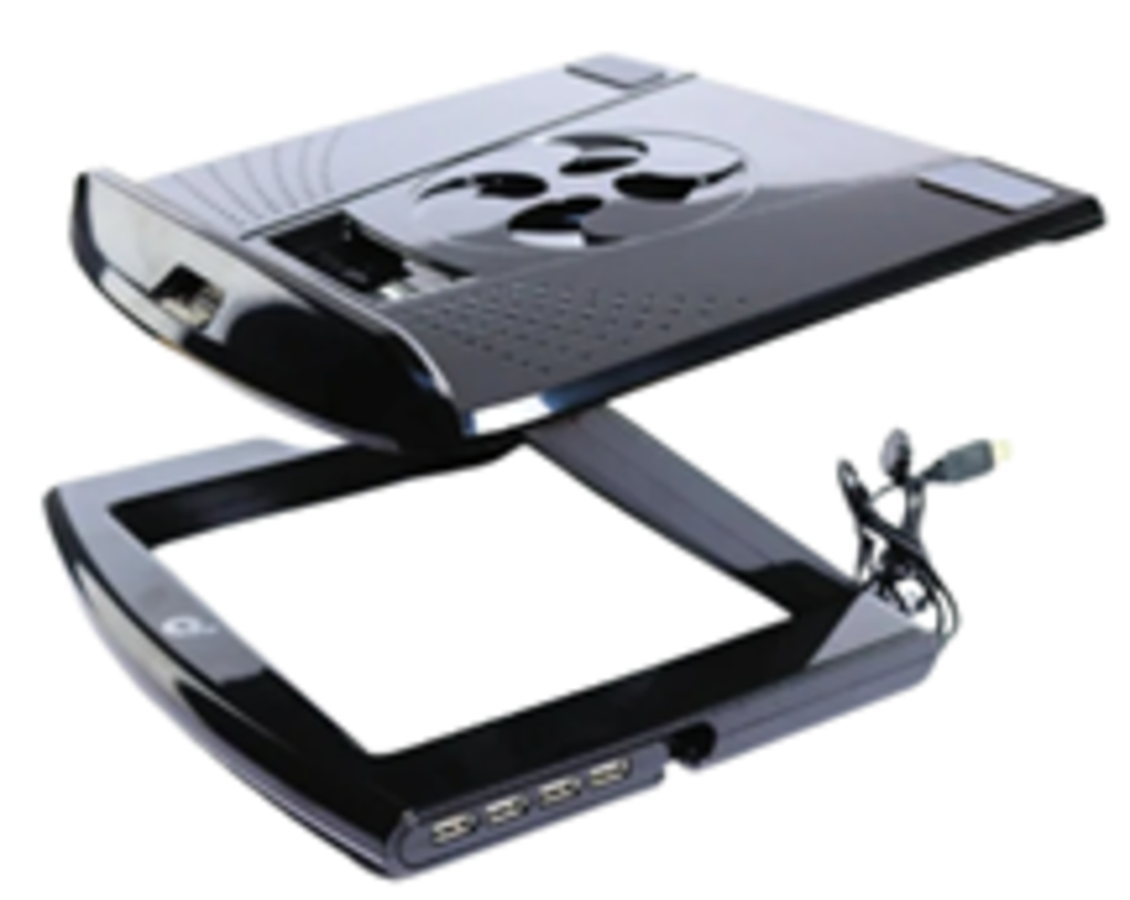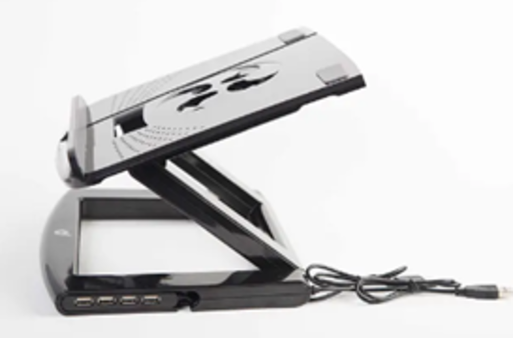 Sturdy, ergonomic laptop/universal cooling stand with detachable 4 port USB 2.0 hub. Also suitable for positioning video projectors or books.