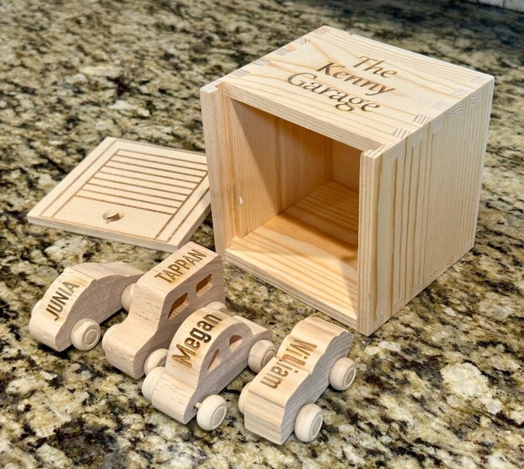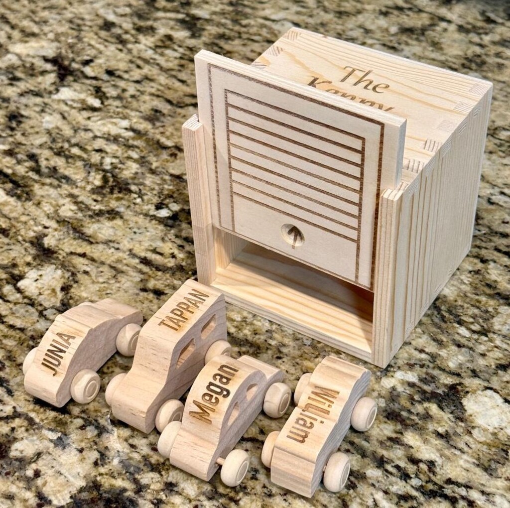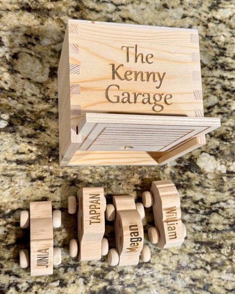 This personalized box with family name is designed to look like a garage and comes with up to 4 cars also personalized with names. Box measures 4.5 inches by 4 inches by 1.5 inches.