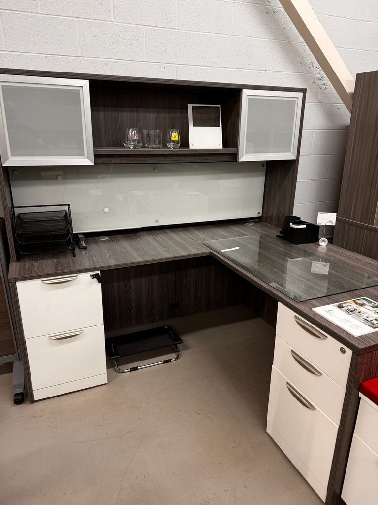 Enhance your workspace with this sleek, modern desk! This desk features a spacious 66" x 30" main desk, a 42" x 24" return, and a 72" wide hutch. It comes complete with file drawers for optimal organization and a convenient magnetic glass board attached to the hutch. pickup only, Monday through Friday, between 8:00 AM and 4:00 PM.