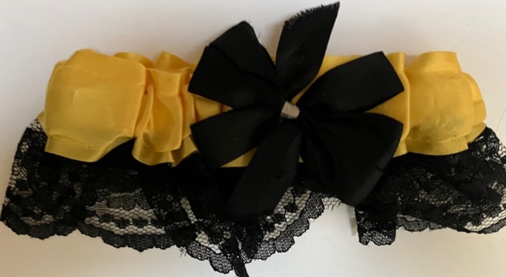 New Black Lace & Yellow Satin Garter. Decorated with large black bow. One Size Fits All. Measures 7” Across Front; 2 1/2” High.