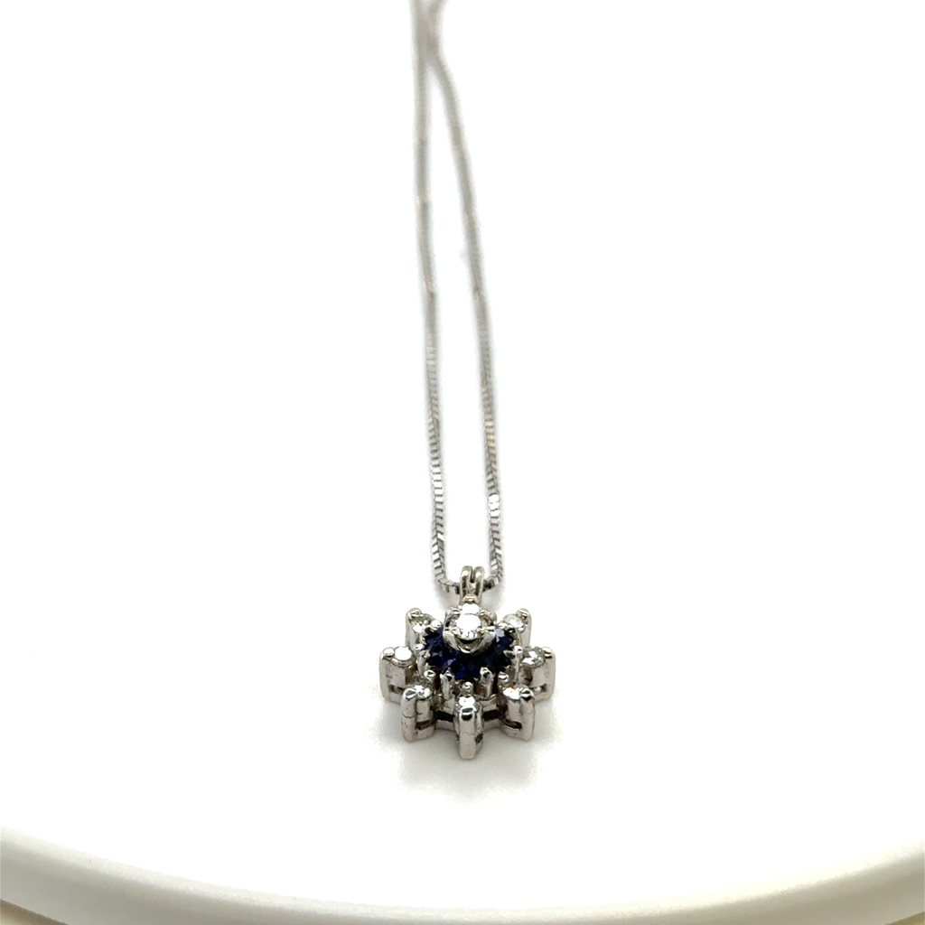 Flower like pendant w 1/4ctw diamonds and sapphire accents on an 18" wg box chain 14k I-15311