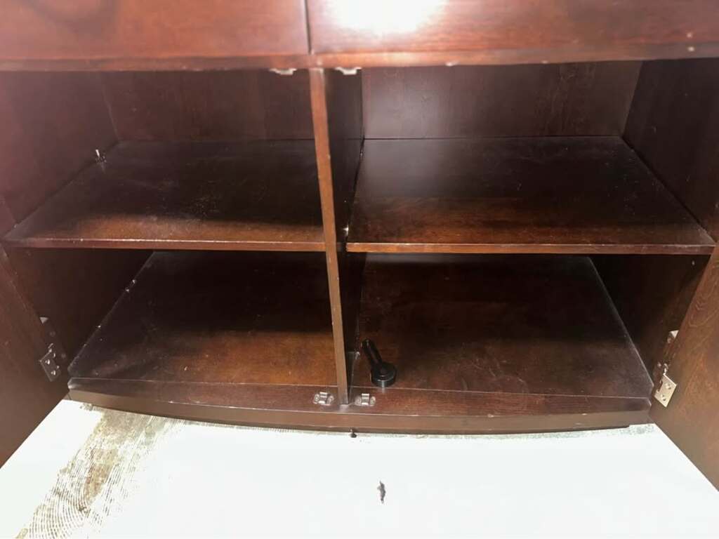 Wood kitchen cabinet with two pullout drawers, and two storage cubbies. Each side has an extendable leaf that can be pushed in or pulled out. Perfect for a coffee bar, traditional bar, kitchen storage, or sideboard.