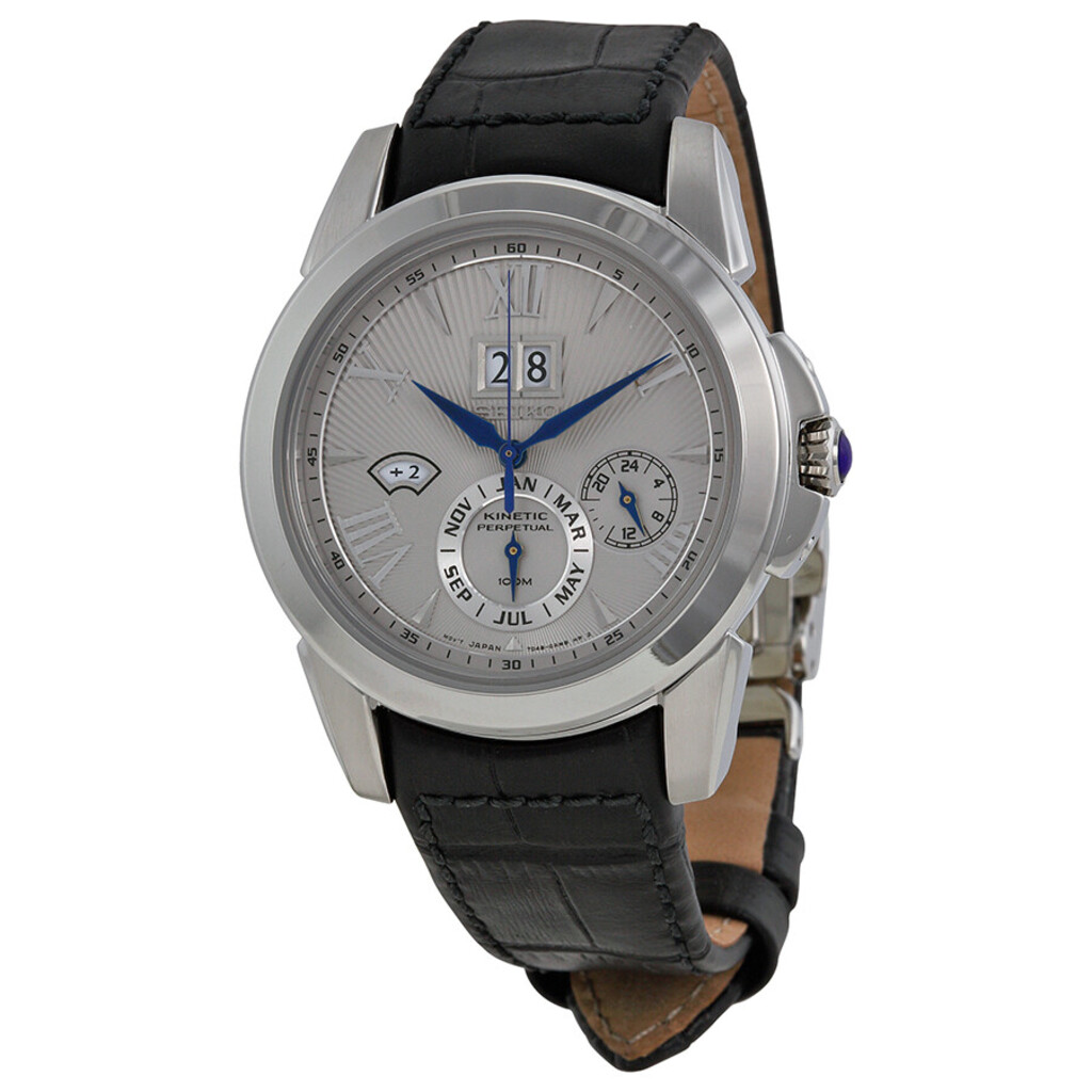 Silver-tone stainless steel case with a black leather strap. Fixed silver-tone stainless steel bezel. Silver dial with blue hands and index and Roman numeral hour markers. Minute markers around the outer rim. Dial Type: Analog. Luminescent hands and markers. Date display below the 12 o'clock position. Three sub-dials displaying: 24 hour and month and leap year indicator. Seiko Caliber 7D48 auto-quartz movement. Scratch resistant sapphire crystal. Cabochon crown. Solid case back. Round case shape, case size: 42 mm, case thickness: 13 mm. Band width: 22 mm. Deployment with push button release clasp. Water resistant at 100 meters / 330 feet. Functions: perpetual calendar, leap year, month, big date, GMT, second time zone, hour, minute, second. Kinetic Perpetual Series. Casual watch style. Watch label: Japan Movt. Seiko Kinetic Perpetual Calendar Men's Watch SNP107.