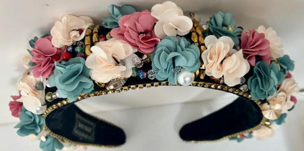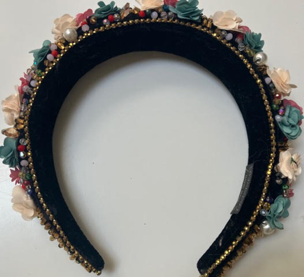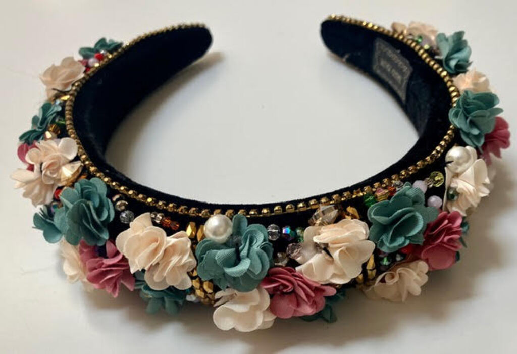 New Decorative Floral Headband With Faux Pearls & Crystals. Handmade flowers with black velveteen padding. Measures 16” Around Rim.