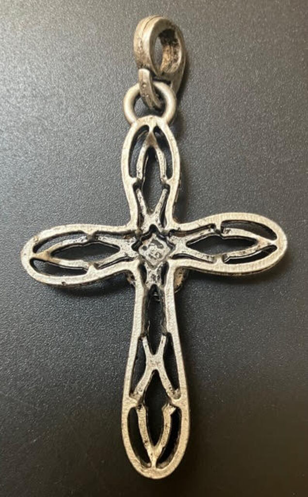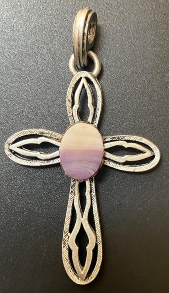 Sterling Silver Cross Pendant With Pink Inlay Quartz. Unusual vintage Pendant. Measures 2 3/4” High; 1 3/4” Wide.