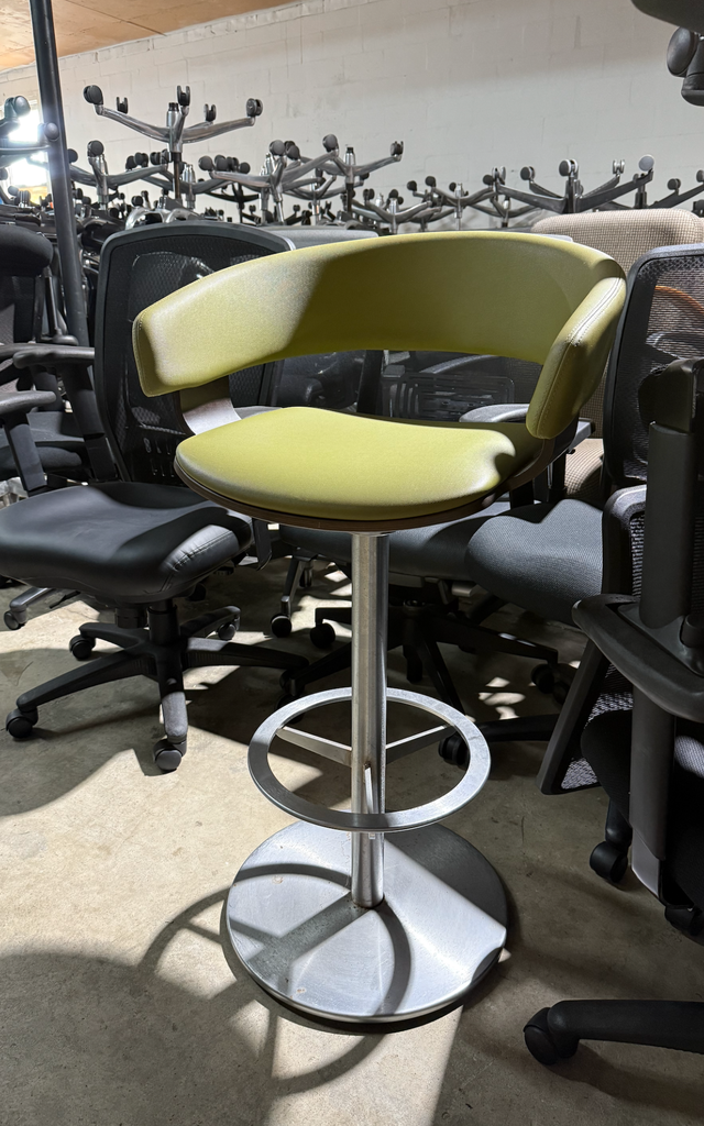 This stool features a metal base, footrest, and cushioned green seat with back support,perfect for break rooms, cafés, or collaborative office spaces