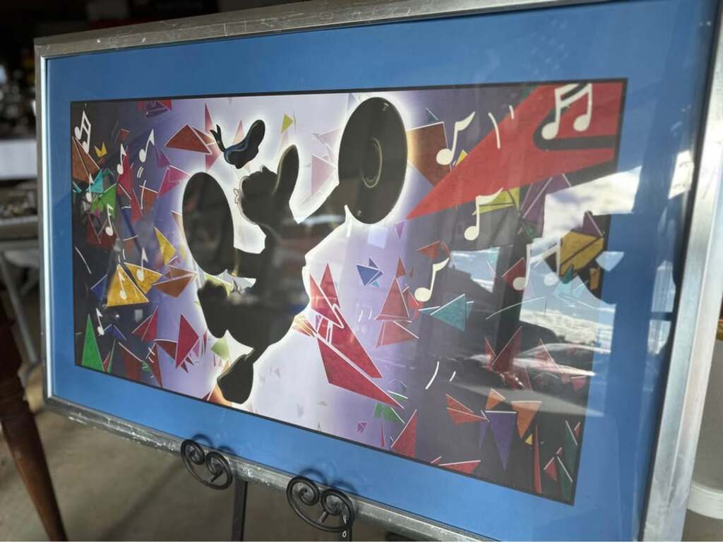 Selling a framed Disney art print featuring an abstract take on Donald Duck The iconic silhouette is shown surrounded by a burst of colorful shapes and musical notes. It’s got a really lively, energetic vibe.