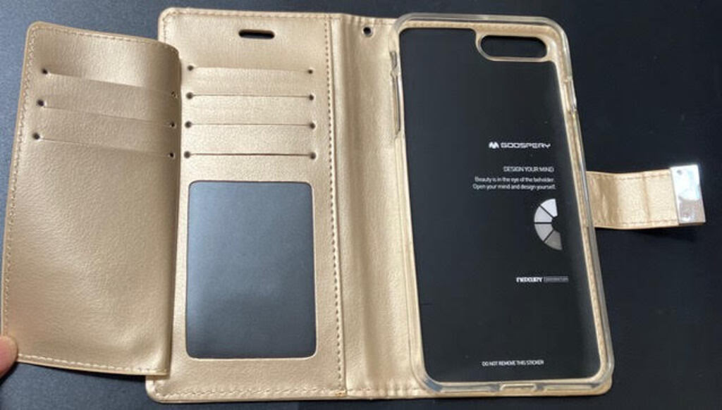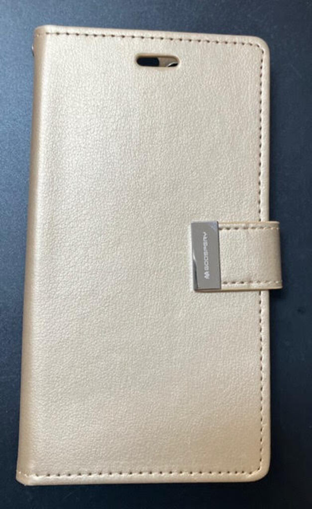 New Gold Leather Goospery Phone Case. Space for credit cards. Fits phone which measures 6” High; 3” Wide. Great looking.
