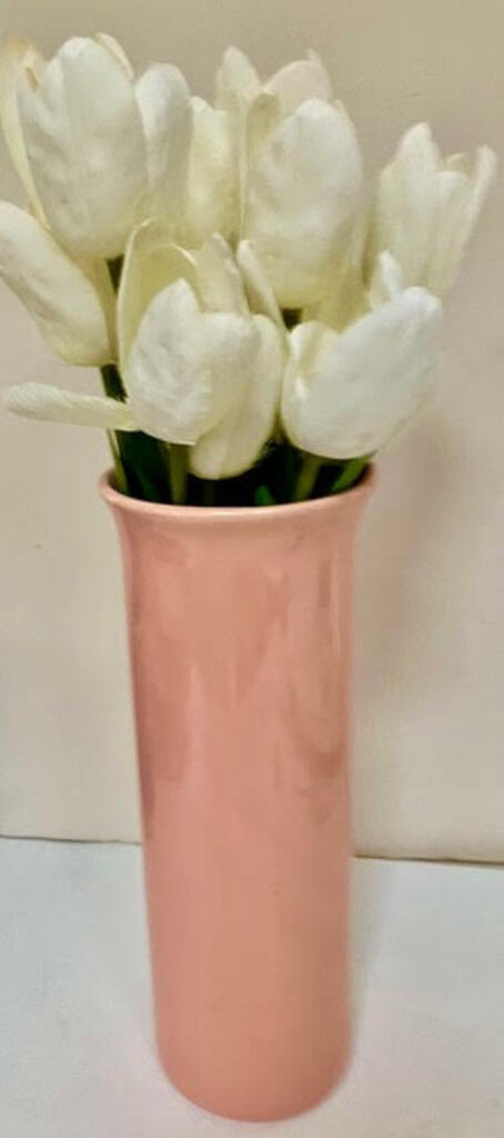 Salmon Ceramic Vase With New White Silk Tulips. Lovely decor vase with 14 tulips. Measures 17” High; 5” in Diameter. Vase is in Excellent Condition.