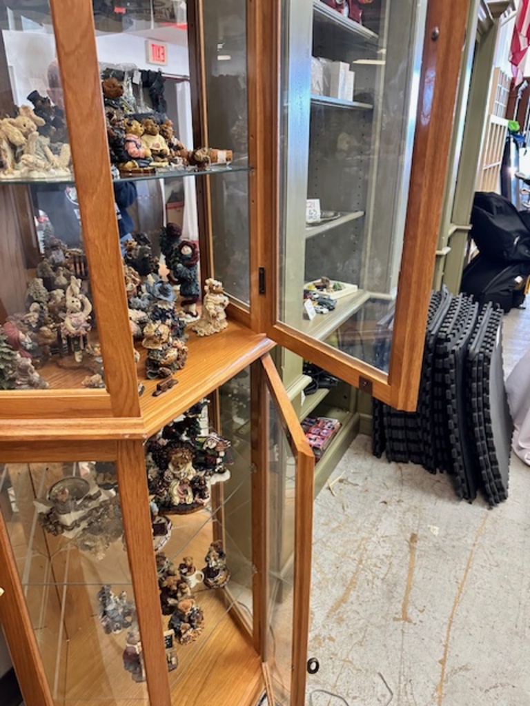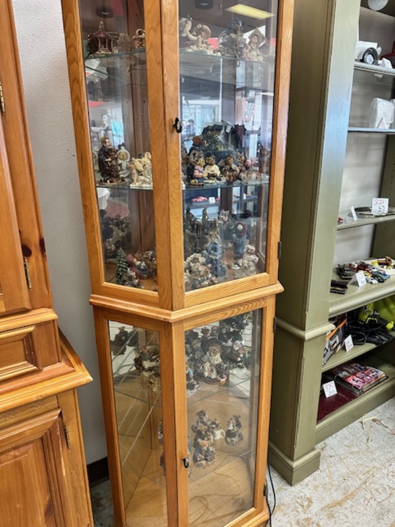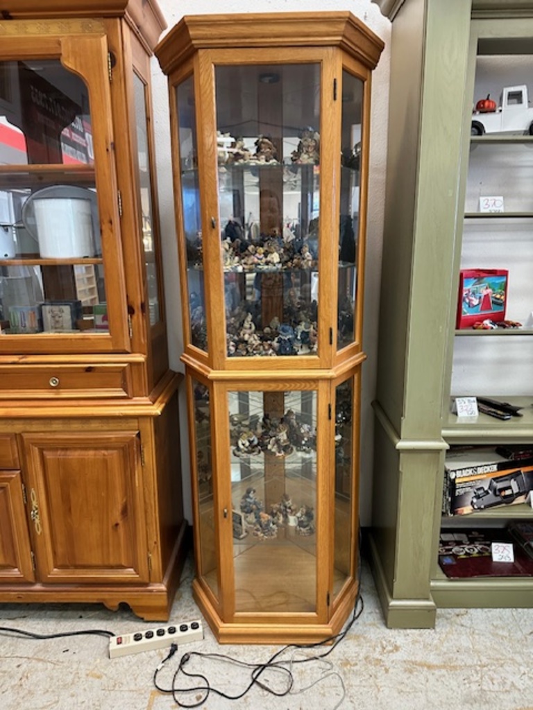 This cabinet fits perfectly in the corner. It lights up so you can see all your treasures (treasures seen are NOT included) This cabinet has 5 shelves and can fit all sorts of treasures.
