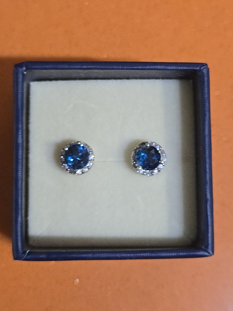 3/4 carats total weight .925 sterling silver setting (2) round 4mm London blue topaz (20) 1.1mm white zircon 7mm W x 3mm D Post backs .7 grams each