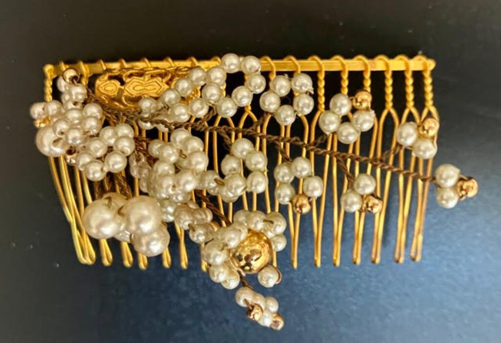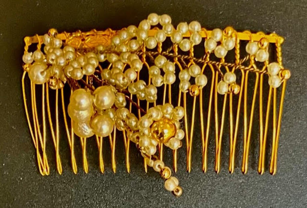 New Faux Pearl Hair Decoration. Gorgeous gold tone hair pin. Measures 2 3/4” Across; 1 1/2” High.