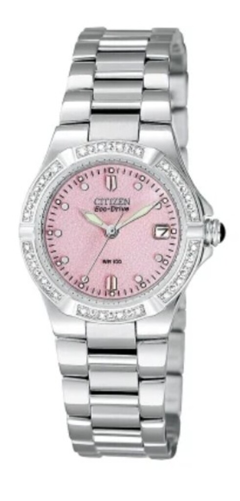 Style Information: A stainless steel watch with pink accents. This is an Eco-Drive watch that is completely powered by light, this extraordinary innovation converts light from virtually any source into electrical power. This revolutionary technology eliminates the need to ever replace batteries.