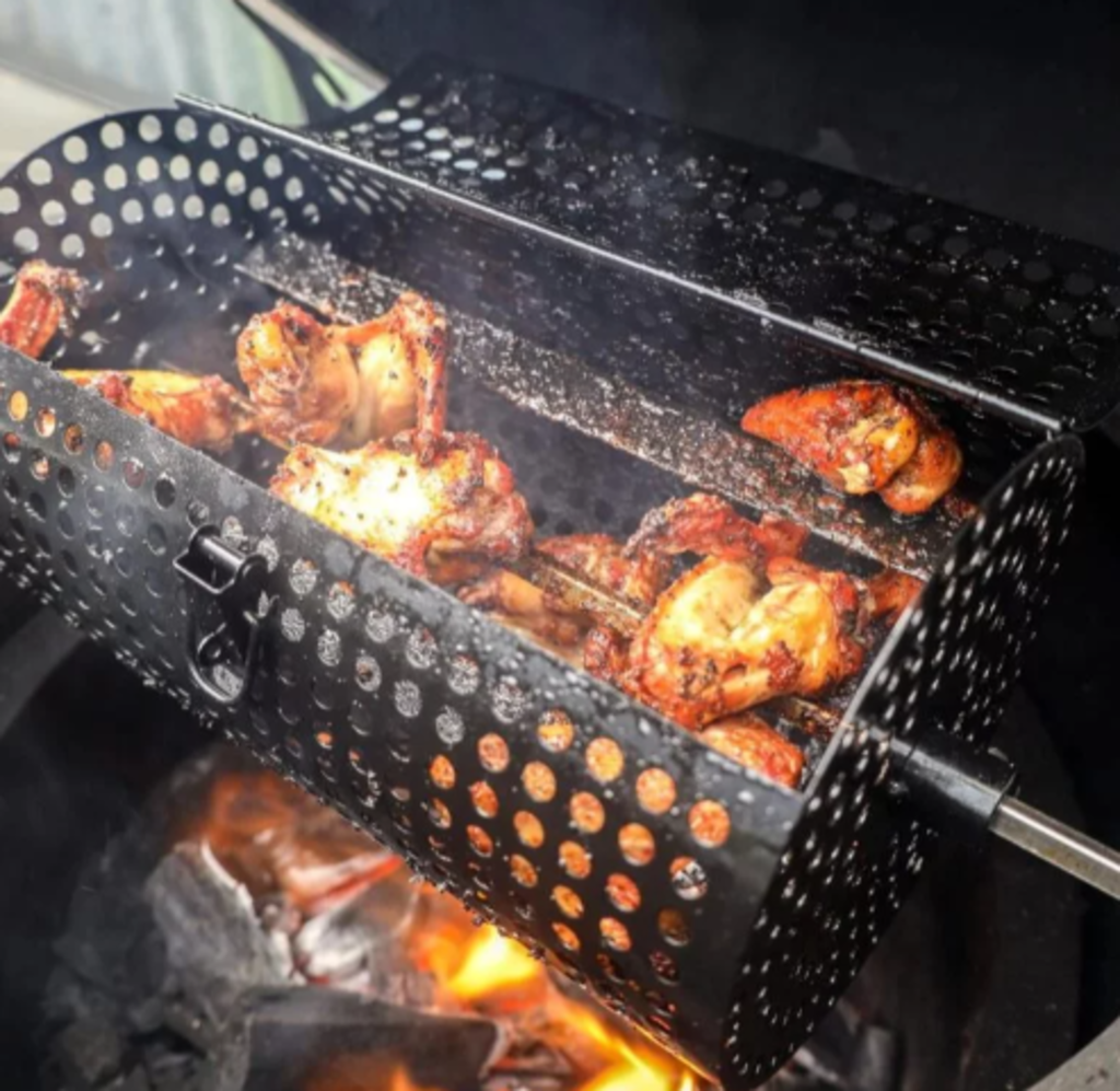 The durable, non-stick, coated steel tumbler is the perfect addition to the Big Green EGG Rotisserie Kit. The rotating action of the tumbler ensures that smaller items like chicken wings or shrimp are cooked to perfection. The large capacity basket measures 7.5 in (19cm) in diameter.