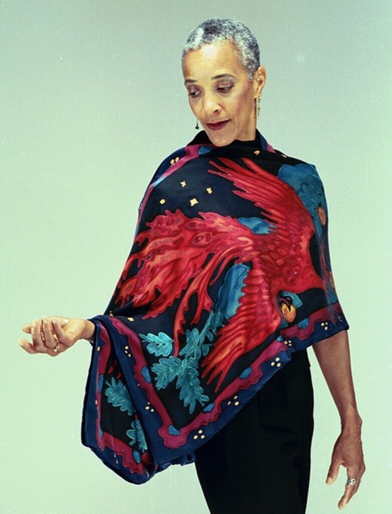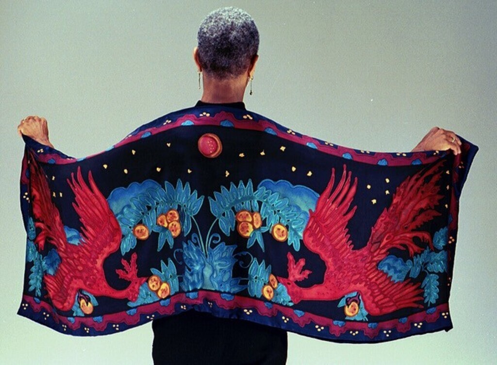 Hand Painted silk charmeuse on one side and silk midnight blue velvet on the other. Limited edition piece originally made for a museum catalogue.