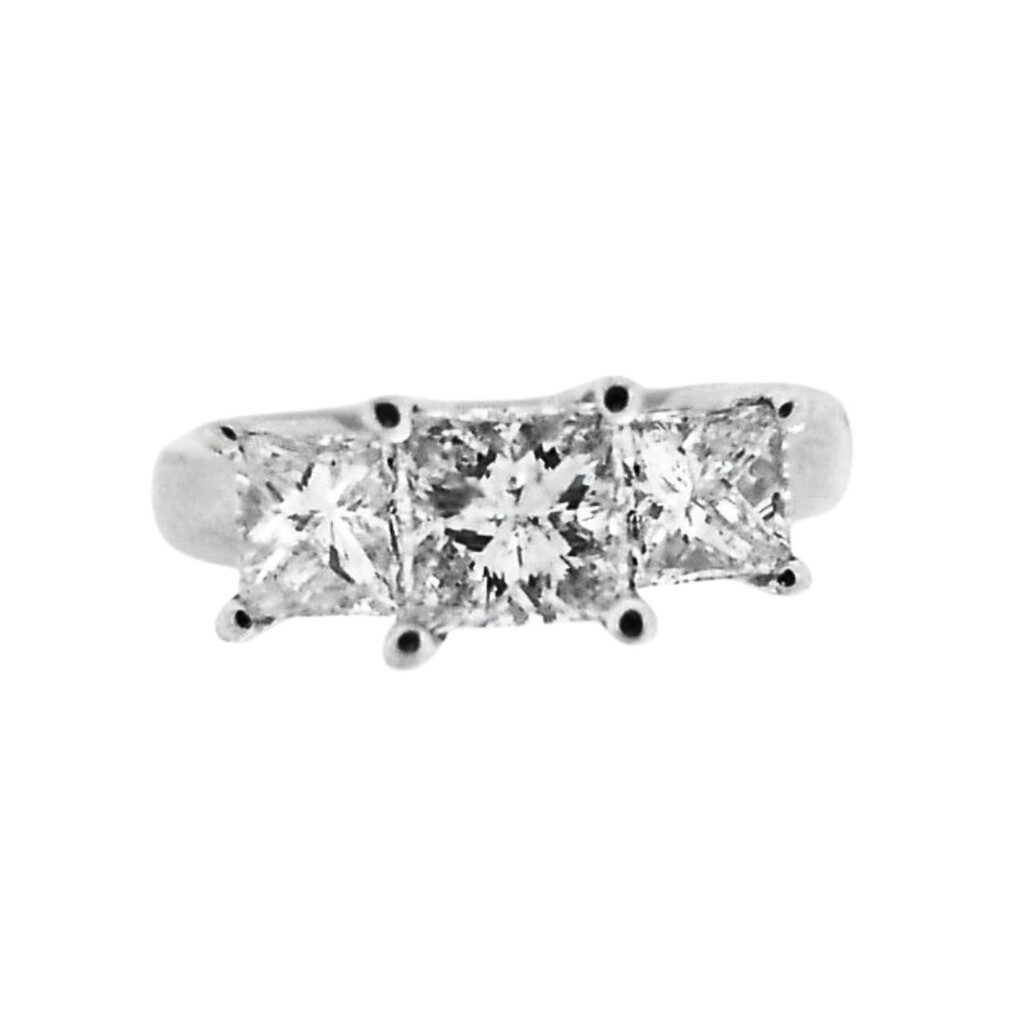 Flanking the center stone are two princess-cut G/H color, Si2 clarity diamonds totaling 0.84 carats, representing the past and future with brilliant symmetry. Set in high-polish 14 karat white gold, this ring offers timeless sophistication with clean lines and classic sparkle.