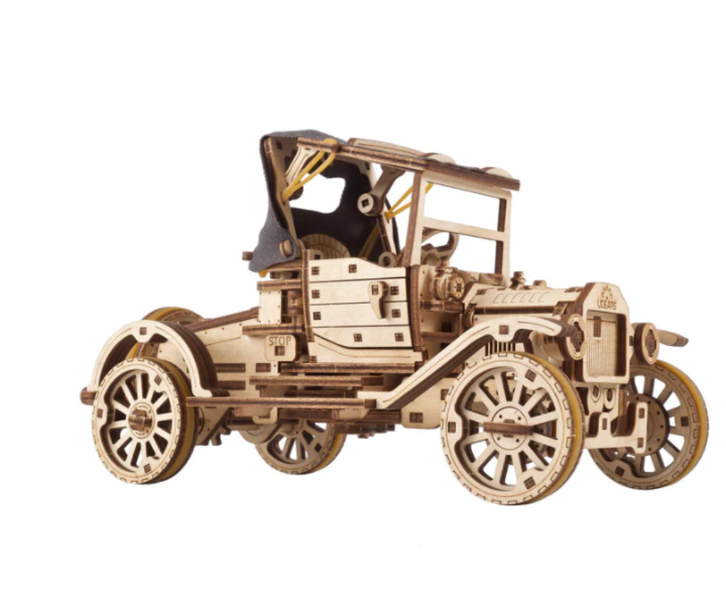 UGears' team of engineers and designers has developed a special, classic car model to take you back to that age. Outstanding features include the functional convertible folding roof with fabric overlay; latching cab doors that open to the front; the hood that opens on both sides, revealing a functional 4-cylinder engine with crankshaft; a skeuomorphic pendulum that simulates the sound of a rumbling motor; front wheels that turn using the steering wheel; and a spare wheel mounted at the back.