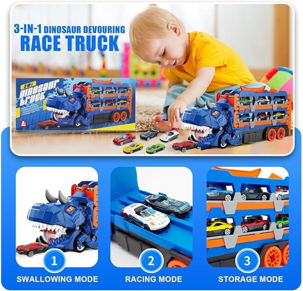 Dinosaur Transform Swallowing Race Car Toy Set: This Dinosaur Truck Toy for Kids is suitable for children aged 3-8 years old, with a handheld top for easy portability, a break-open switch on the back of the car with a dual-way 1.57m long track, comes with 12 mini die-cast race carts, supports racing, swallowing of small carts and transforming into standing dinosaurs, and the toy truck can store up to 16 small cars.