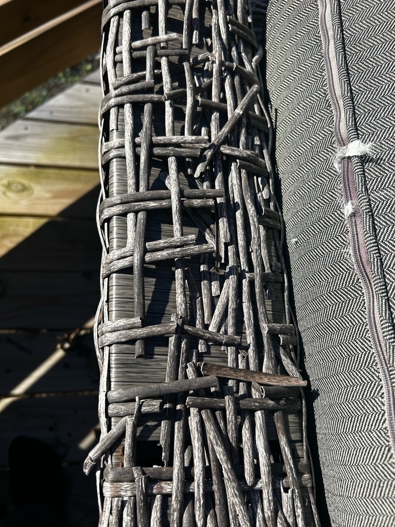 Older and well loved 2pc patio set, cushins have seen better days but still hold firm shape. Fully sturdy but the plastic wicker is starting to come apart . For pickup only