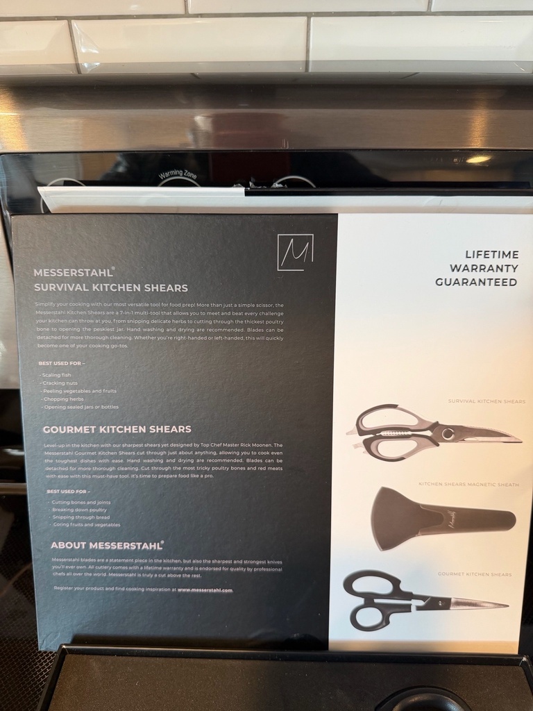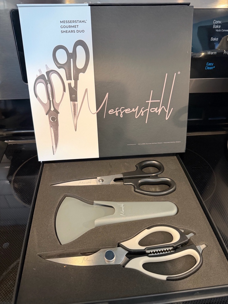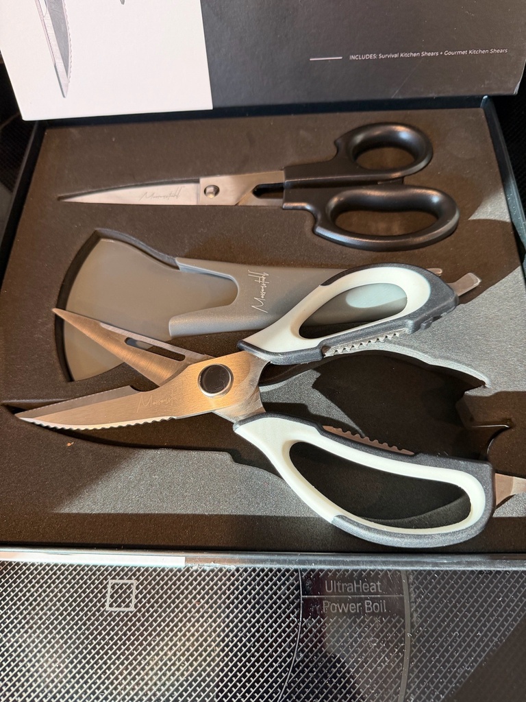 Gourmet Kitchen Shears- cutting bones and joints, breaking down poultry, cutting fruits and veggies, snipping bread. SURVIVAL SHEARS- scaling fish, cracking nuts, peeling veg and fruits, chopping herbs, opening jars and or bottles, self defense. Reg $189 sale $139
