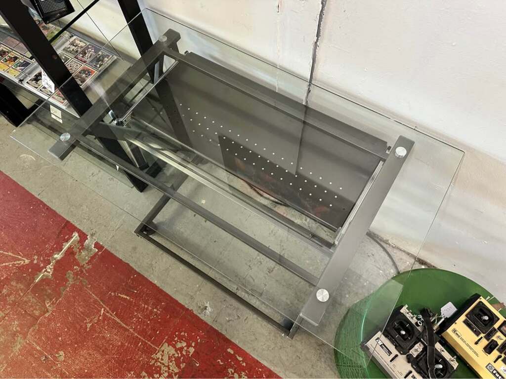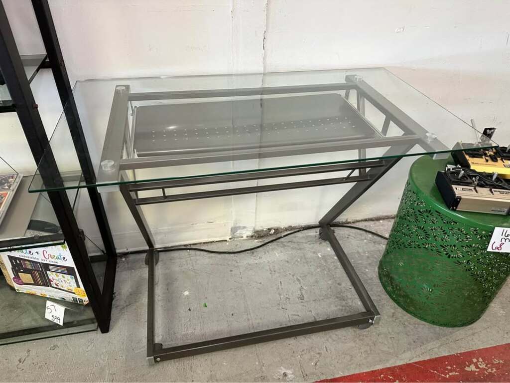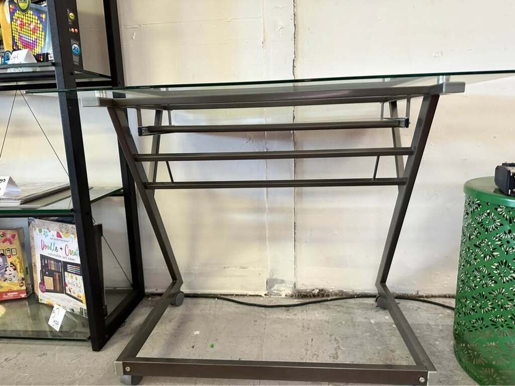 Modern tempered glass computer desk with a sliding keyboard tray and powder-coated steel frame.