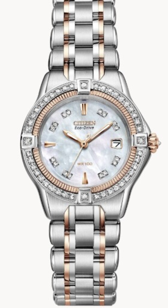 From The Signature Collection. Feminine charm with attention to detail . The Quattro Diamond features 61 diamonds encircling the stainless steel and rose gold tone case. Diamonds mark the hours on the mother of pearl dial and accent the crown of this beautifully appointed timepiece.