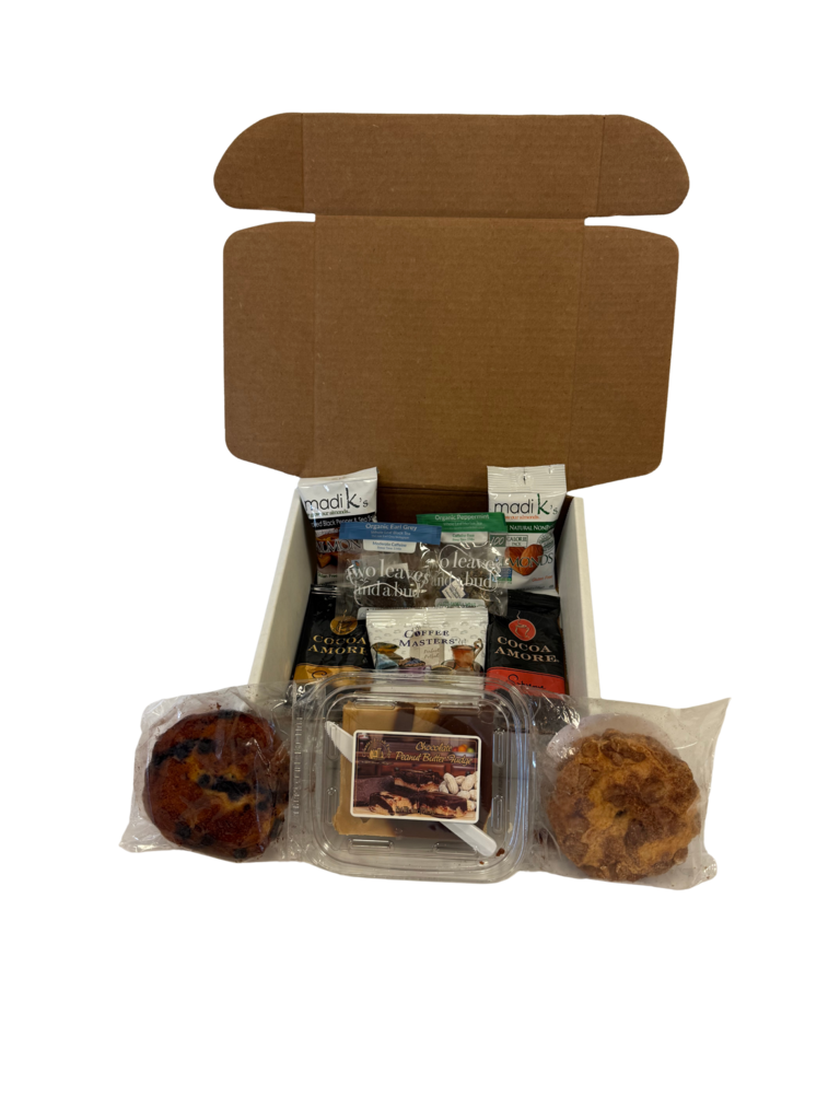 This box contains 2 mini cakes (cinnamon walnut and blueberry - single serving sizes of our delicious coffee cakes!), 2 Cocoa Amore cocoa packets, 2 Two Leaves organic tea bags and 1 coffee packet from Coffee Masters which makes a “perfect potful,” plus 6oz. Country Fresh Fudge and Madi K’s seasoned almond snacks. Sales tax, if applicable, and $10 shipping will be paid in cash.