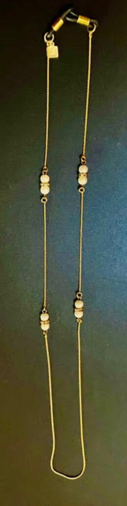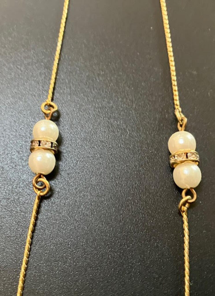 New Long Pearls With Gold Tone Chain Necklace. Lovely white faux pears with rhinestone bands decorate this necklace. Measures 13 1/2” Long.