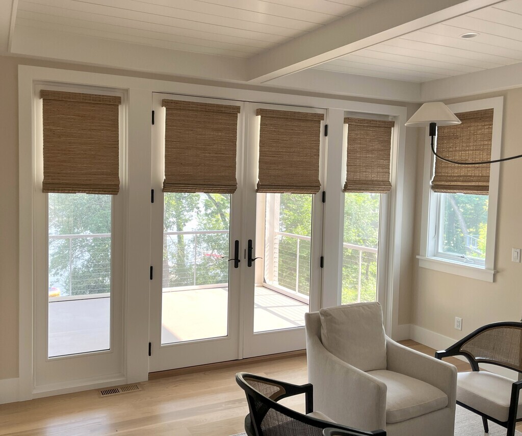 Hunter Douglas. One of the best names of window treatments in the industry. Natural Woven Shades. Color = Tahiti Ginger (Light Tan), no liner. Cordless. With valance at top.