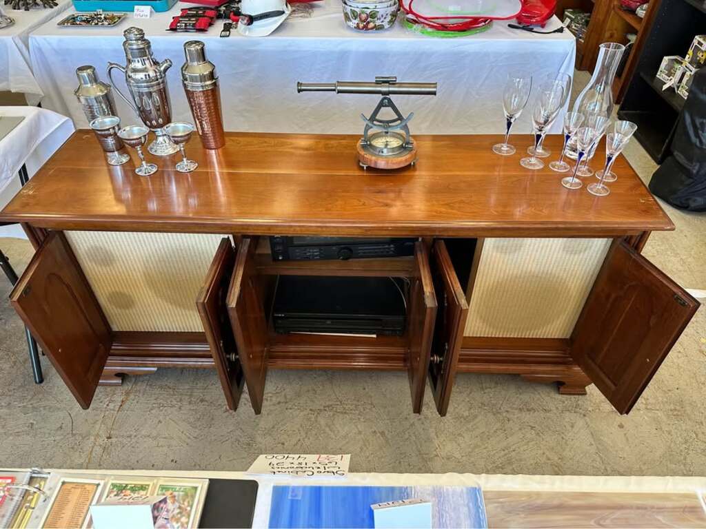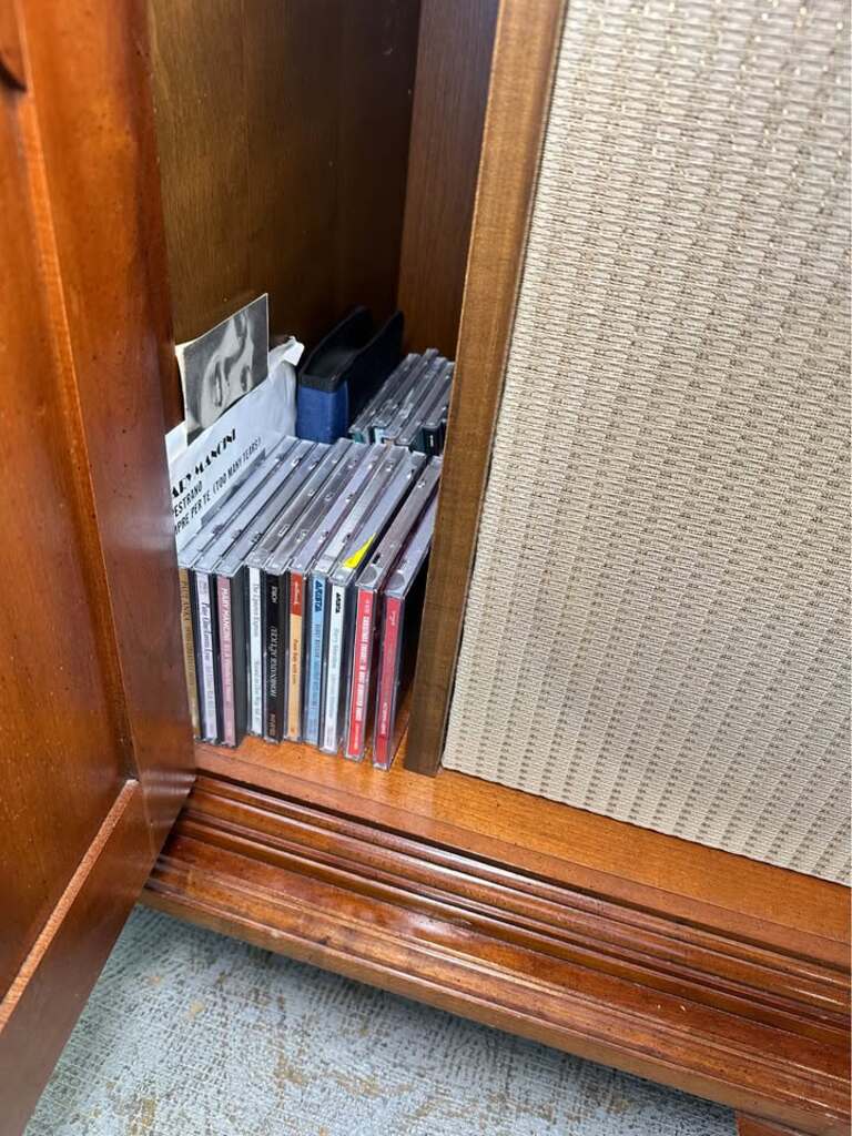 Mid-century modern stereo console cabinet in perfect working condition. Comes with JVC Radio Receiver and Sony 5 Disc Loader.