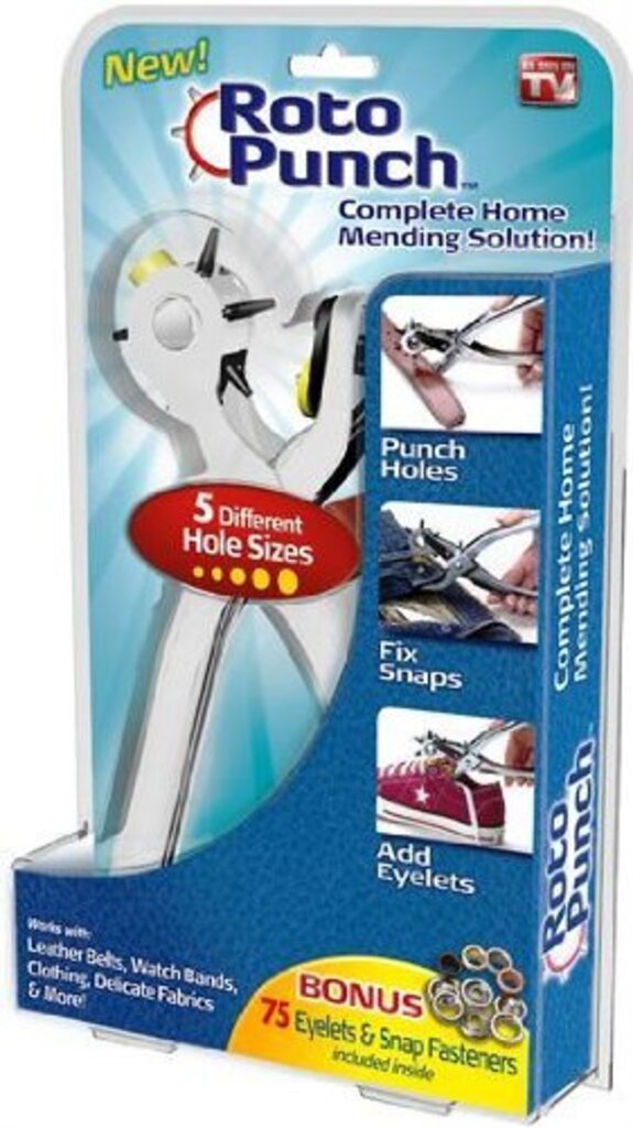Roto Punch Complete Home Mending Solution Now you can punch extra holes, fix worn out snaps and eyelets in seconds. Roto Punch tool is the complete home mending solution that lets you quickly punch a hole in a belt, purse strap or watch band, add eyelets to sneakers or outdoor gear, and even replace worn out snaps on pants and blouses. It punches through the thickest leather and all types of fabrics. The adjustable wheel allows you to switch between 5 different hole sizes with just a twist. It also includes 75 assorted eyelets and snap fasteners for joining together two sections of leather or fabric. Perfect for repairing clothing, accessories and more. Features: Add holes to straps Add holes to dog collars Fix snaps on clothing Works on leather, vinyl, plastic, fabrics 5 Different hole sizes Includes: 1 x Roto Punch tool 75 x Eyelets and snap fasteners.