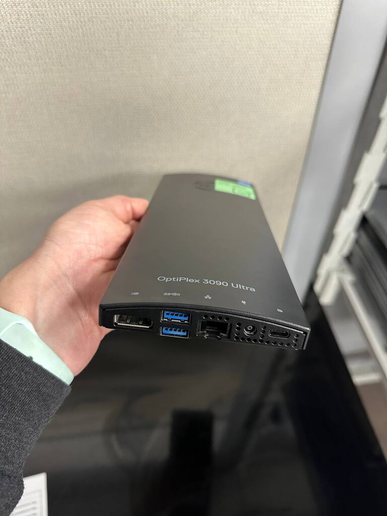 This Dell OptiPlex 3090 Ultra is a compact, small-form-factor business PC. It has multiple ports for accessories and comes with a stand that can hold a monitor (monitor not included). This listing also includes a 65 Watt Dell Charger for the power source.