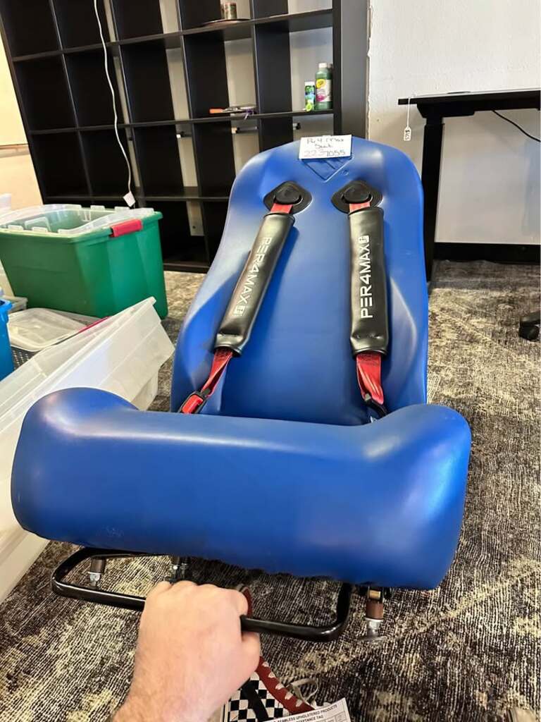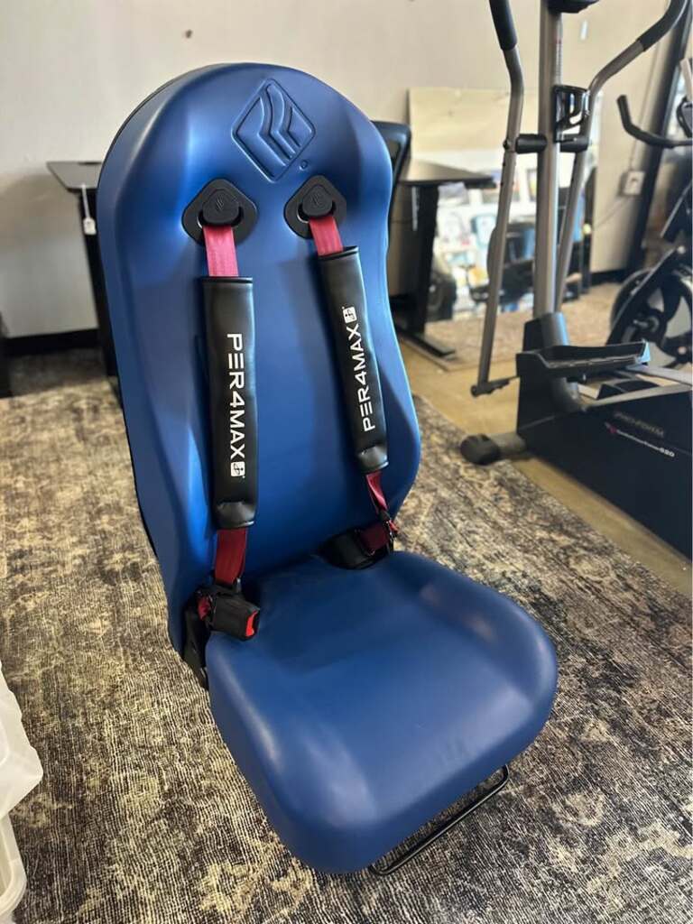 This emergency vehicle chair comes with a PER4MAX 4-point harness system and is designed for EMT safety, featuring controlled deceleration technology to reduce crash forces.