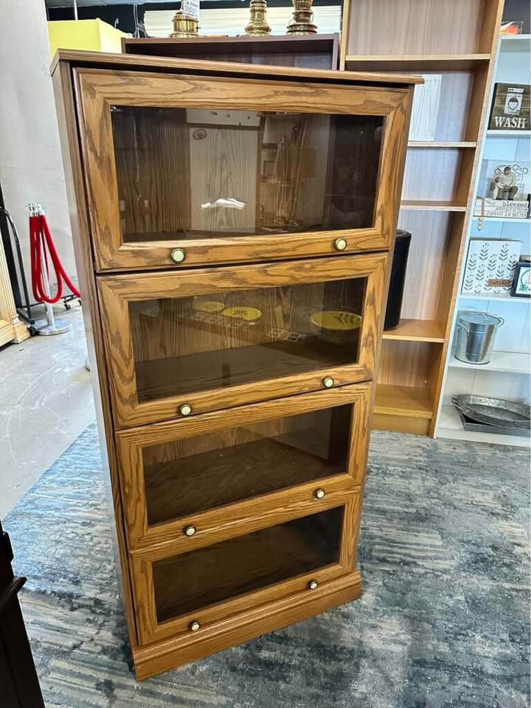 Each tier has a glass door that lifts and slides back for easy access. Features attractive brass-toned knobs.