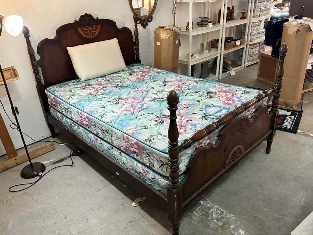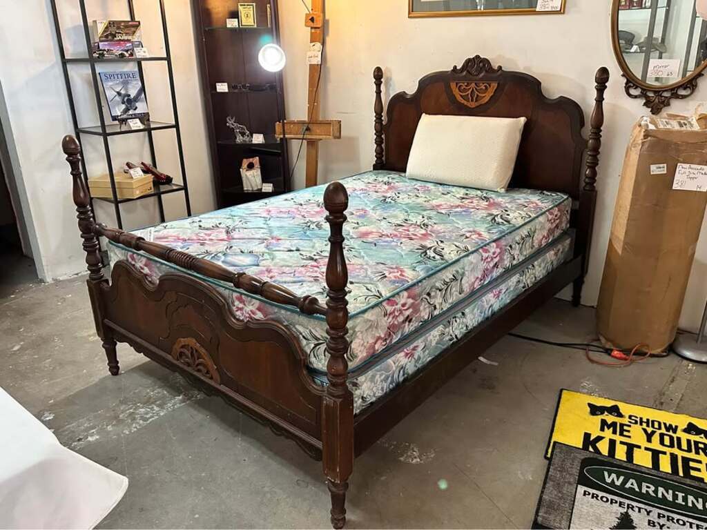 Sturdy full size bed set. Has a cool vintage wood bed frame with carved details and four-poster style. Comes with mattress and box spring. Mattress has a pretty floral pattern.