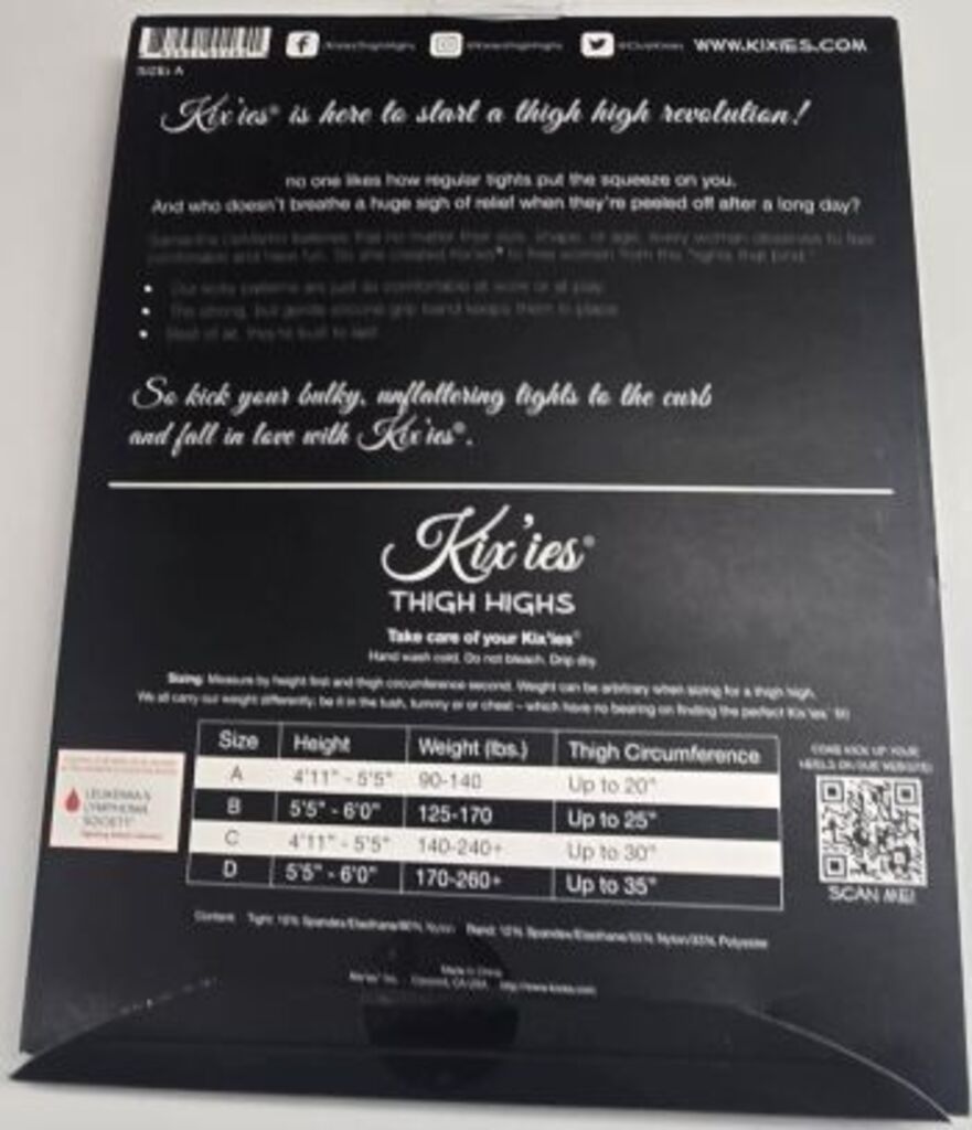 90% Nylon, 10% Spandex. This stocking has an attractive design, a no slip grip and a soft feel. Comfortable, durable, popular, sexy and unique. Ideal for everyday use or for that special occasion. Made in China. Original Kixies stocking. FITTING GUIDE: Fits according to size chart pictured.