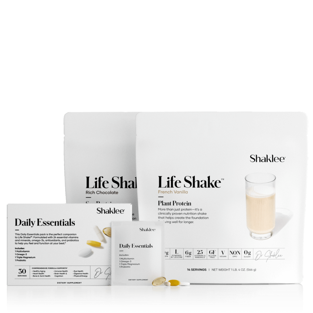 Vita Life Stack makes foundational wellness simple—especially if you’re new to supplements. This easy daily routine combines clinically proven Life Shake™ with the Daily Essentials pack to nourish your body every day. Together they provide fiber, omega-3s, antioxidants, probiotics, and 20 g of clean, plant-based protein activated by leucine, plus close to 100% DV of essential vitamins and minerals to support whole body health.