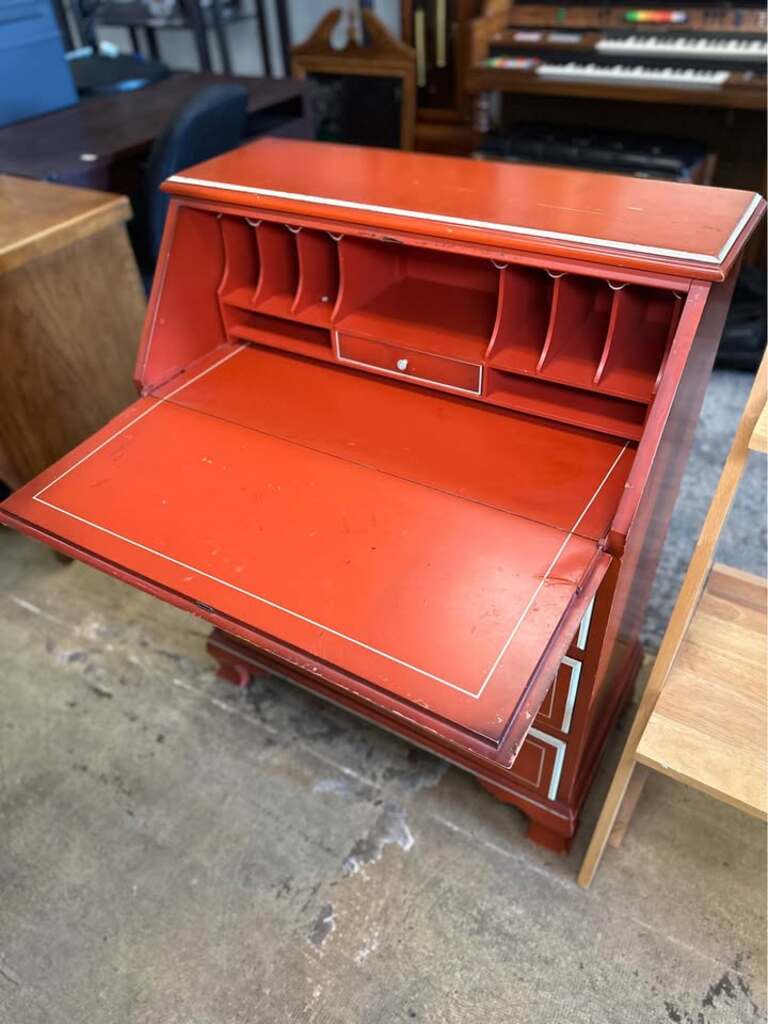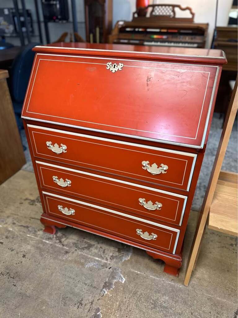 Charming orange-red drop front secretary desk. Has cool white pinstripe details and gold hardware. Drop front opens to reveal cubbies and a small drawer inside. Plus three more drawers below for storage. Great piece for a home office or a cozy corner.