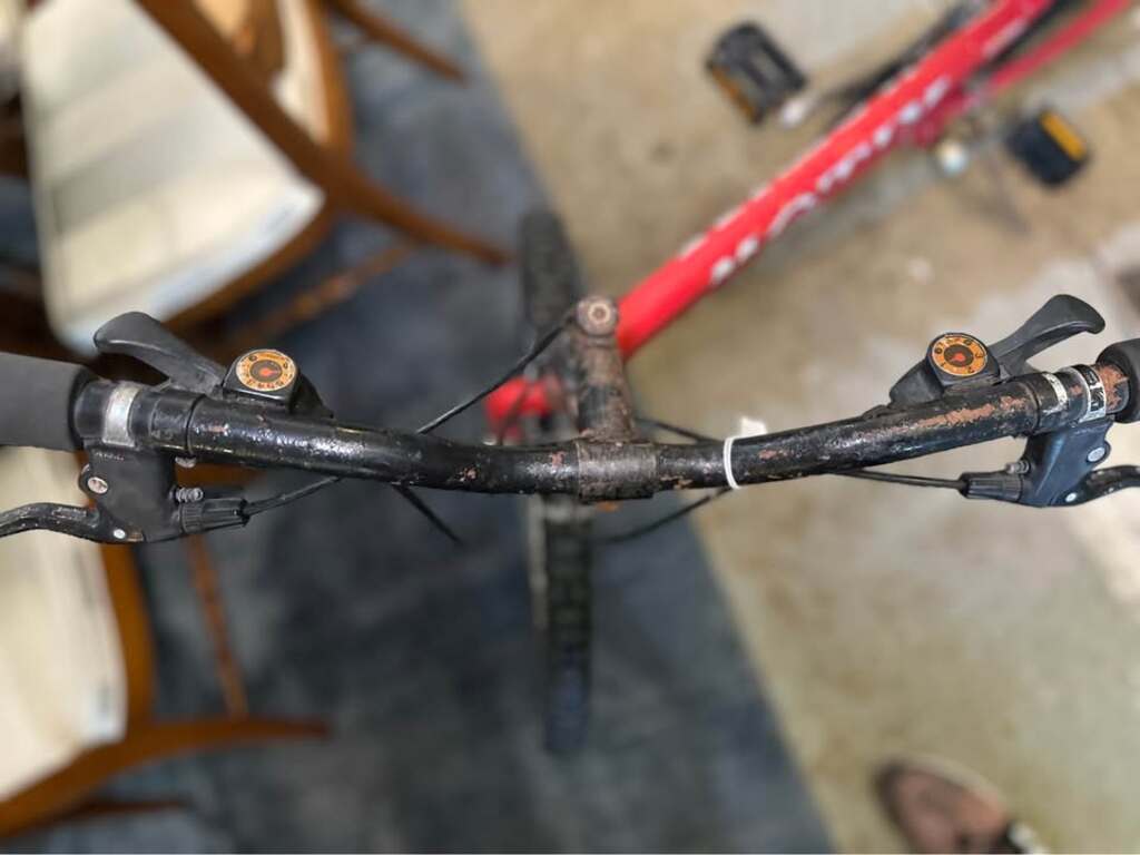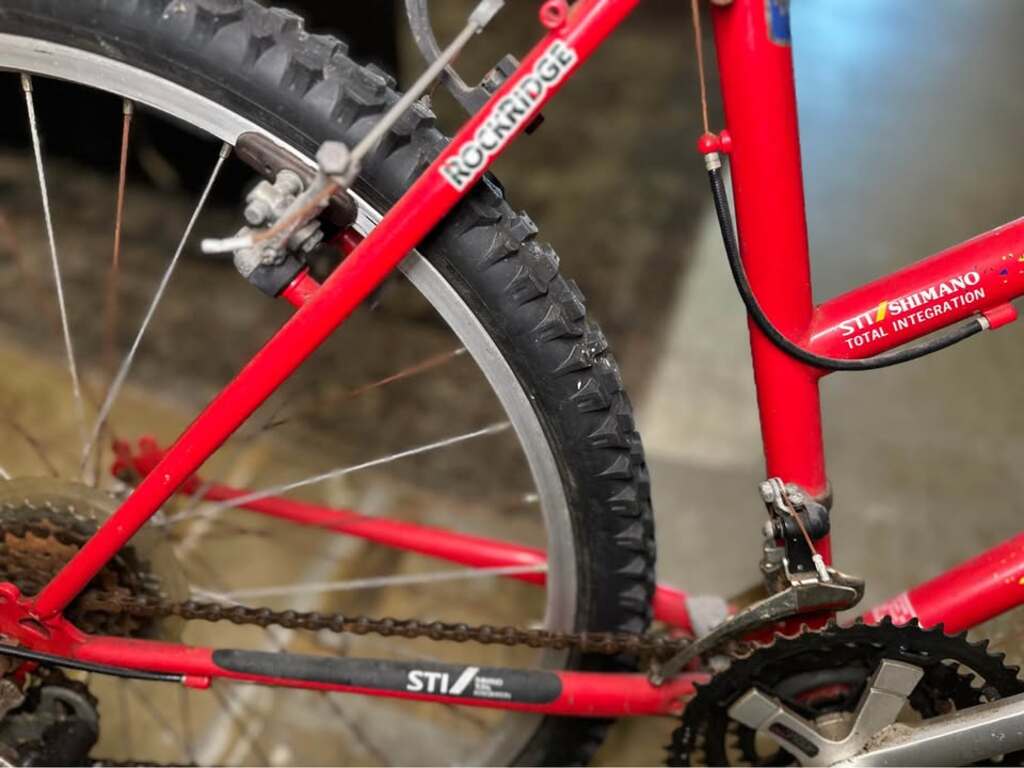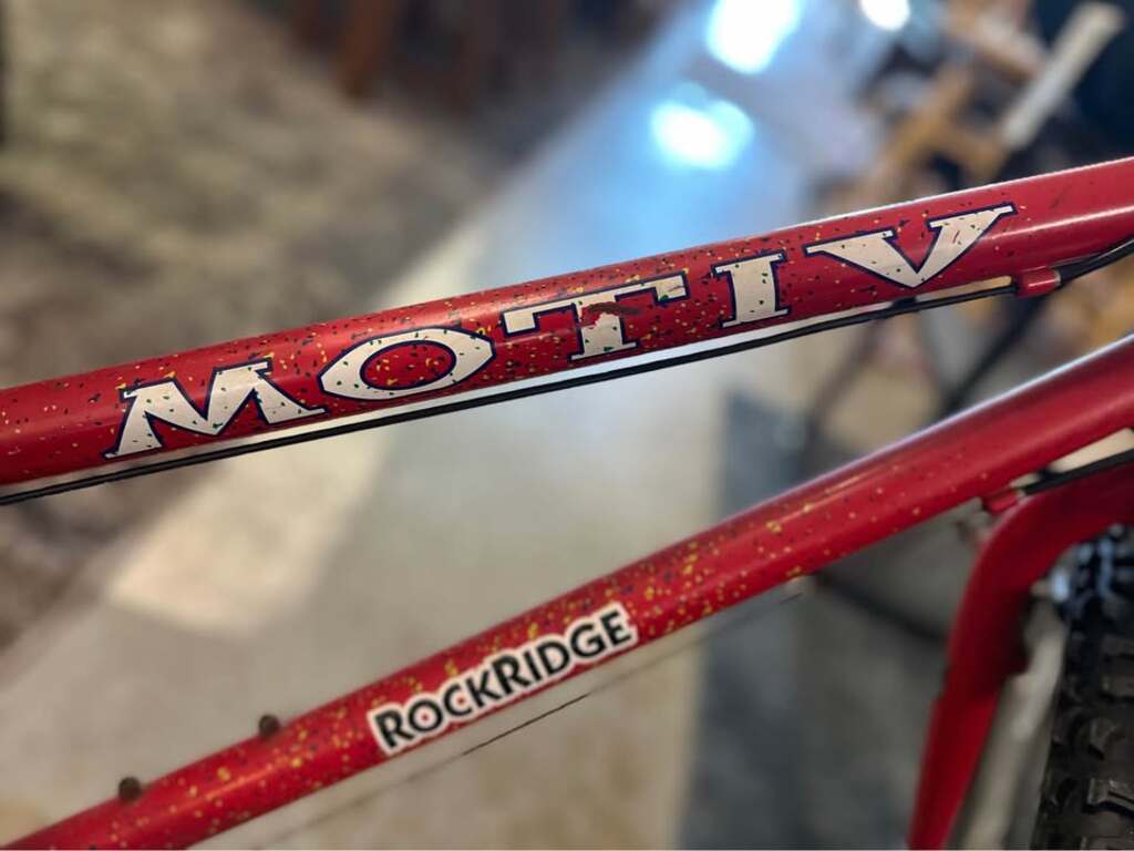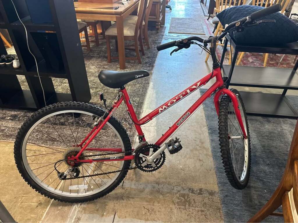 Classic red MOTIV Rockridge mountain bike. Has STI/Shimano Total Integration components. Velo seat is on it. Knobby tires are good for all sorts of rides.