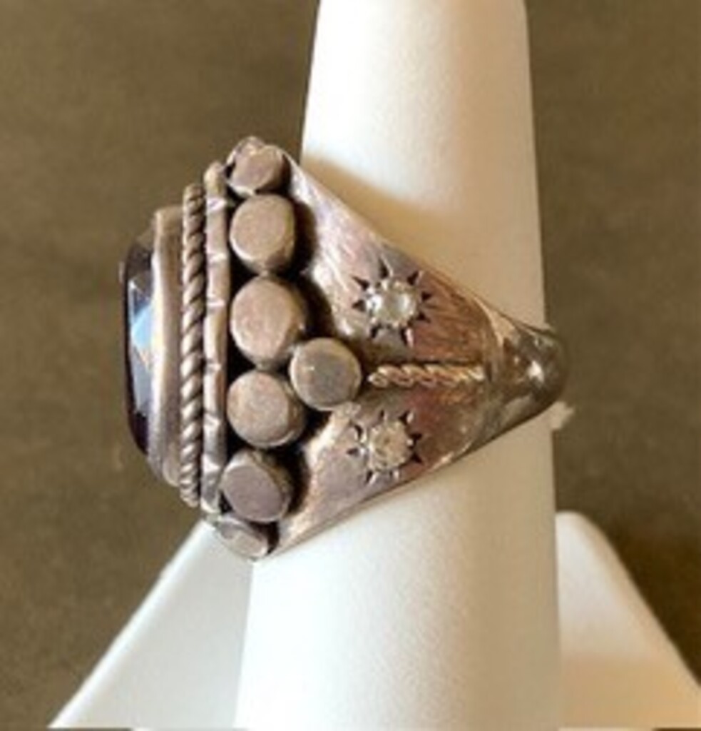 Grecian Amethyst Ring from the Island of Crete Grecian sterling silver ring with amethyst and natural diamond accents.