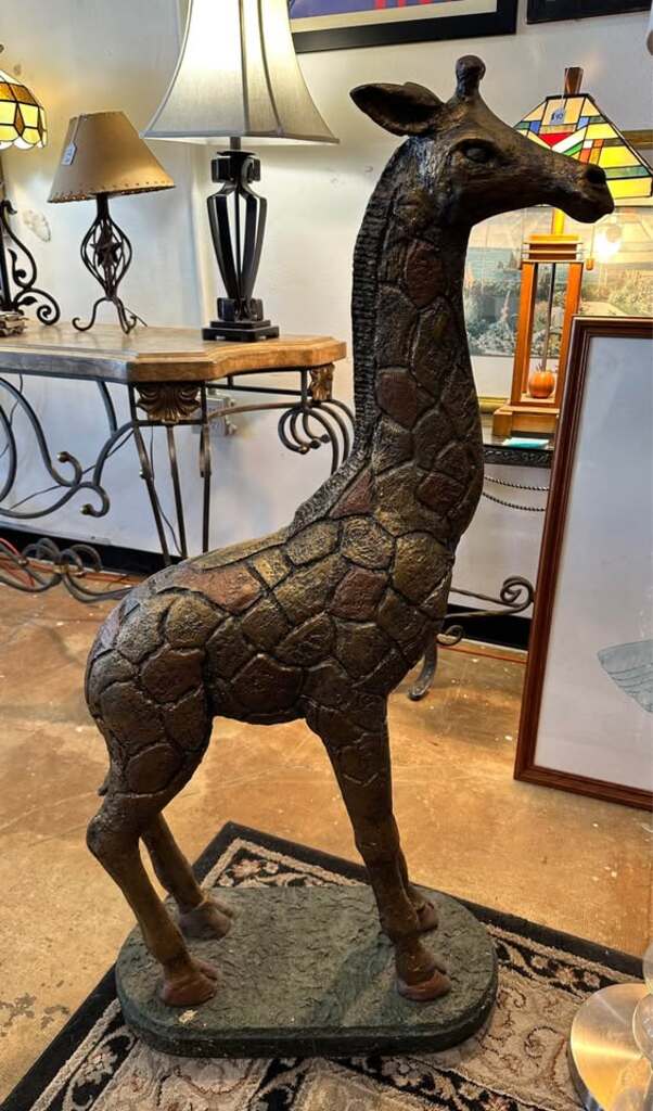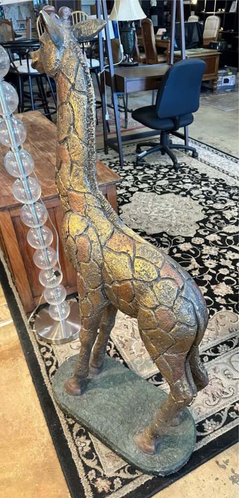 Unique giraffe statue. Has a cool textured, mosaic-like design in bronze and gold colors. Great statement piece for home or garden.