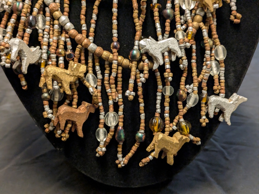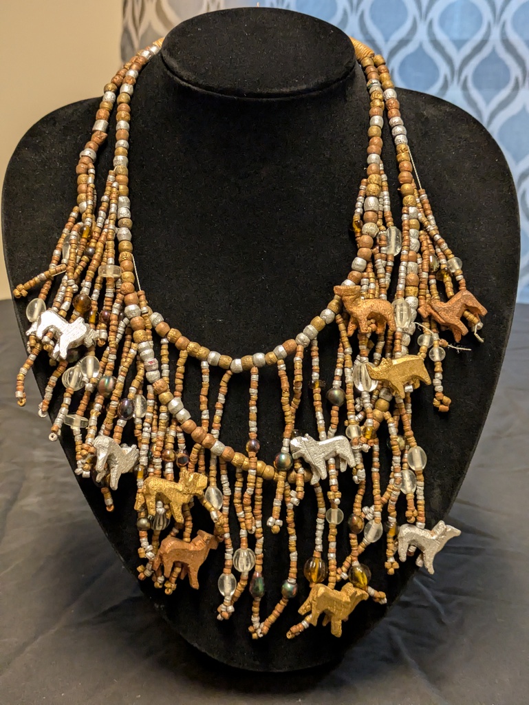 African Tribal , multi-strand Necklace, w/Carved Wooden Animals and Glass Beads