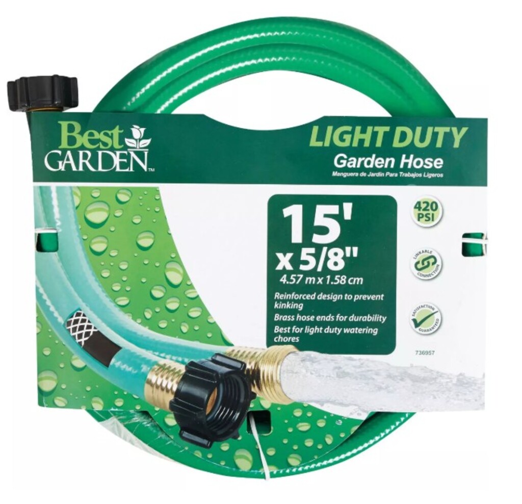 Light duty leader hose. Ideal for connecting hose reel cart to faucet. Made of reinforced multi-layer PVC (polyvinyl chloride) to prevent kinking and offer all weather flexibility. Features brass hose ends. Not safe for drinking water.