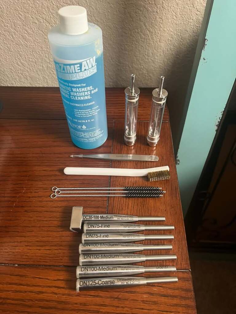 -Endozime Plus cleaning solution -Brass cleaning brush, tweezers